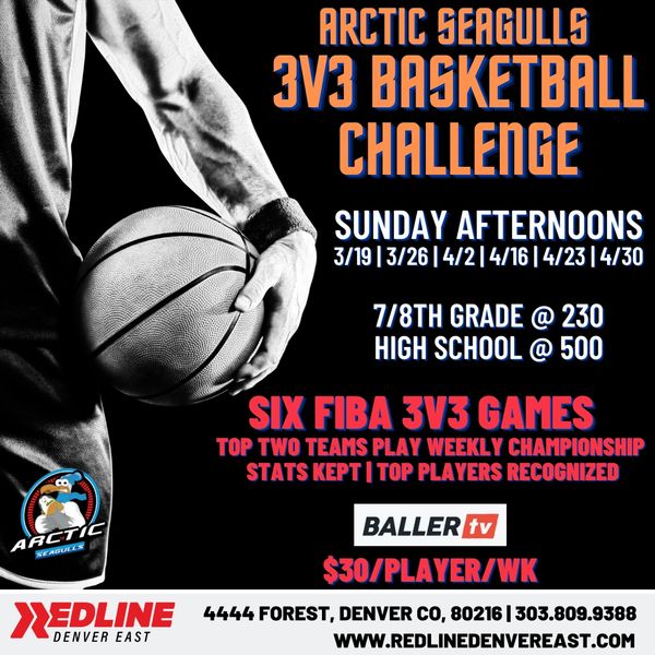 Sessions 1 and 2 of the Arctic Seagulls 3v3 Showcase occur each Sunday at Redline Denver East, located at 4444 Forest, Denver, CO 80216. Spectators are permitted to watch the games. The games will be live streamed in August via Facebook Live and BallerTV. Options for parents to work out during the Showcase will be available by appointment. Follow Redline Denver East on Socials @redlinedenvereast.